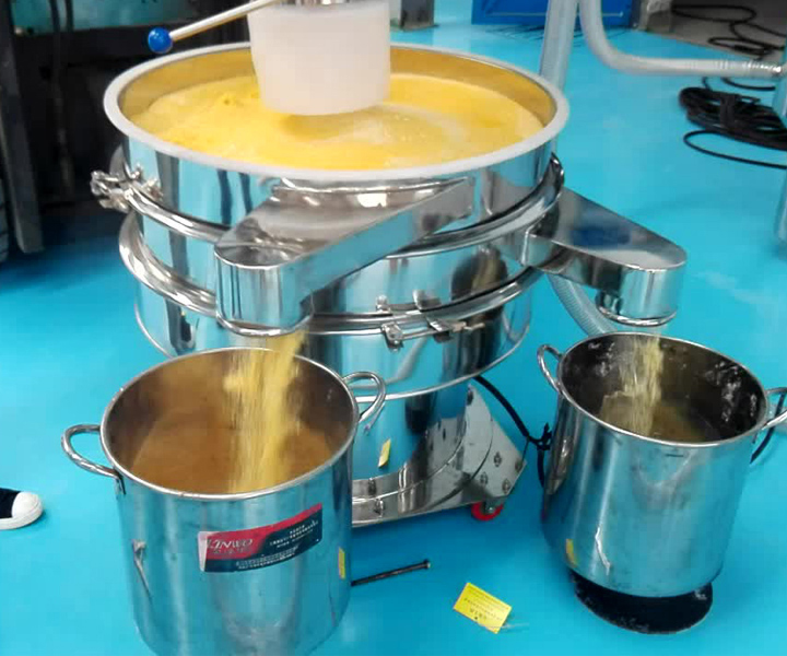 粗砂糖振動(dòng)篩采用YZUL立式振動(dòng)電機(jī)作為激振源,通過(guò)振動(dòng)電機(jī)上下兩端的偏心重錘將旋轉(zhuǎn)運(yùn)動(dòng)轉(zhuǎn)變?yōu)樗?、垂直、傾斜的三次元運(yùn)動(dòng),并傳遞到旋振篩的篩面上;物料通過(guò)入料口進(jìn)入設(shè)備內(nèi),根據(jù)不同物料篩分要求,物料經(jīng)過(guò)1-5層采用不同目數(shù)的金屬編織篩網(wǎng)的篩分層,在這個(gè)過(guò)程中,位于各層的篩網(wǎng)下的清網(wǎng)裝置(橡膠彈跳球)通過(guò)頻率振動(dòng)不斷撞擊篩網(wǎng),使篩網(wǎng)上層物料能夠順暢的透網(wǎng)篩分,并有效解決了物料堵網(wǎng)問(wèn)題出現(xiàn),不同目數(shù)的物料通過(guò)各層對(duì)應(yīng)目數(shù)的篩網(wǎng)后在各層的出料口排出,終實(shí)現(xiàn)篩選除雜或過(guò)濾分級(jí)的目的。